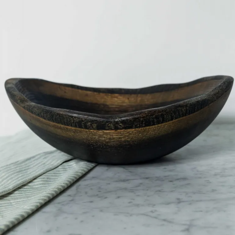 The Oval Wood Bowl Black Ebonized is made by using a natural process to darken wood that still allows the beautiful wood grain to show through. The ebonizing process reacts with the tannins in the wood to create bowls that are dark brown to black and 100% food safe. Our ebonized bowls are most frequently made from oak wood which is a sought-after hardwood known for being strong, heavy, and straight-grained.