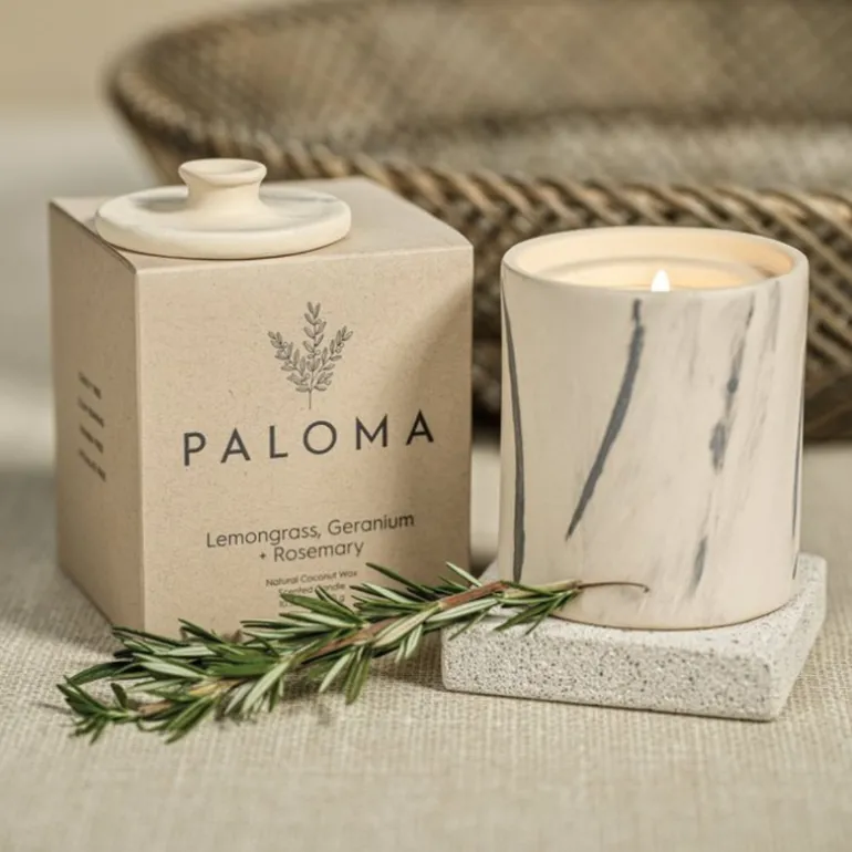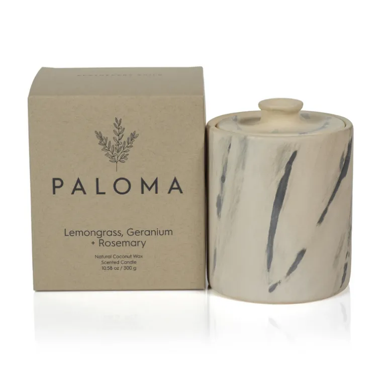 The Paloma Candle is crafted onto a natural marble holder and features a fresh scent of lemongrass, geranium, and rosemary. It burns for up to 75 hours, filling your space with elegant notes that will make special days and nights even better.