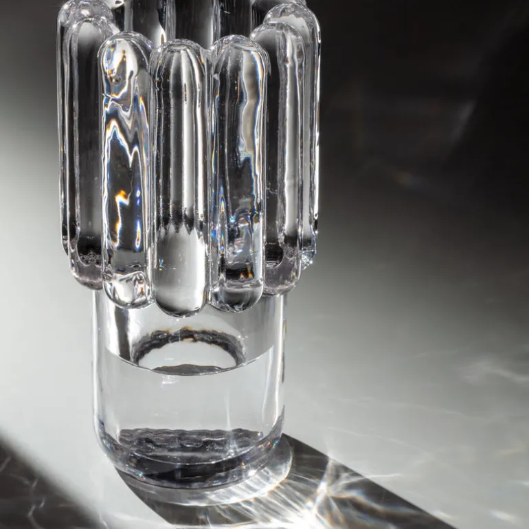 Press is a medium-sized vase, designed and engineered to catch and refract light, and to last forever. This heavyweight grooved vase is made of chunky coils of pure and clear transparent glass. Bold in silhouette and simple in function.