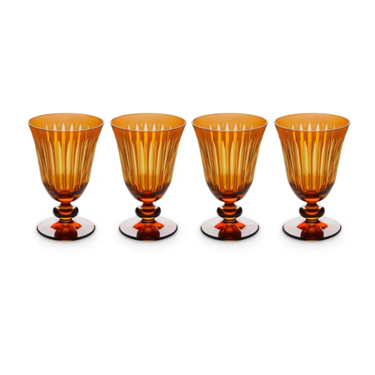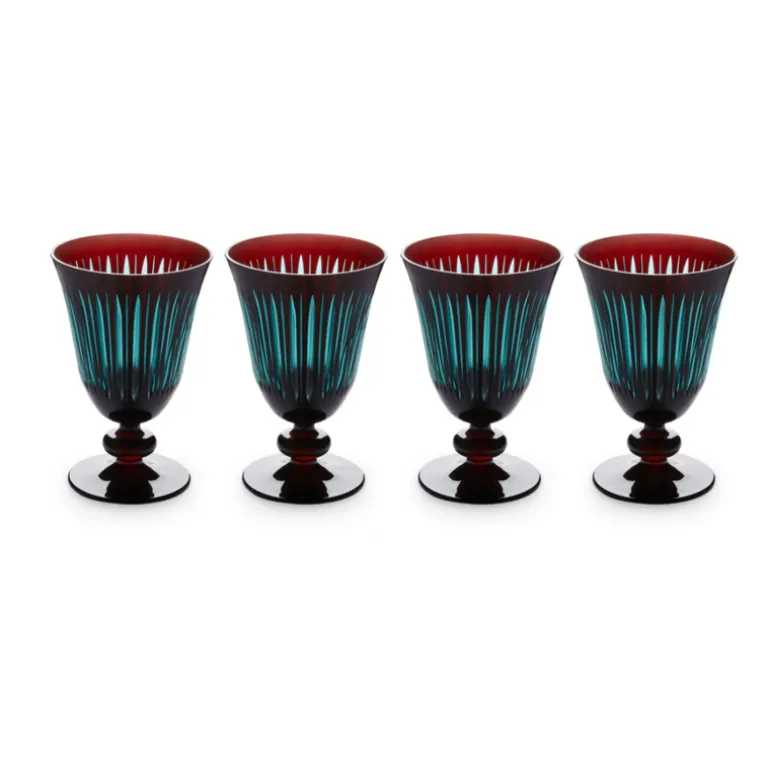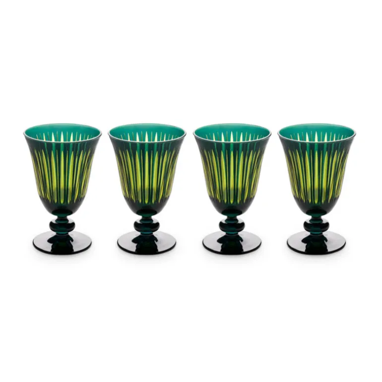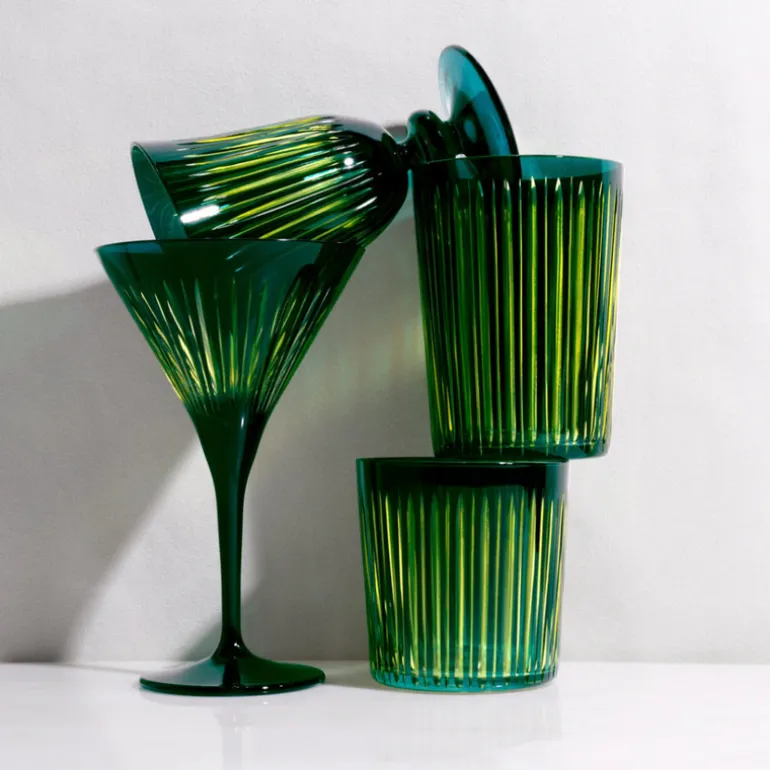 A glassware collection of bold color combinations, hand-cut and decorated to playfully reflect light. Available in Amber, Green, Purple, and Bordeaux.