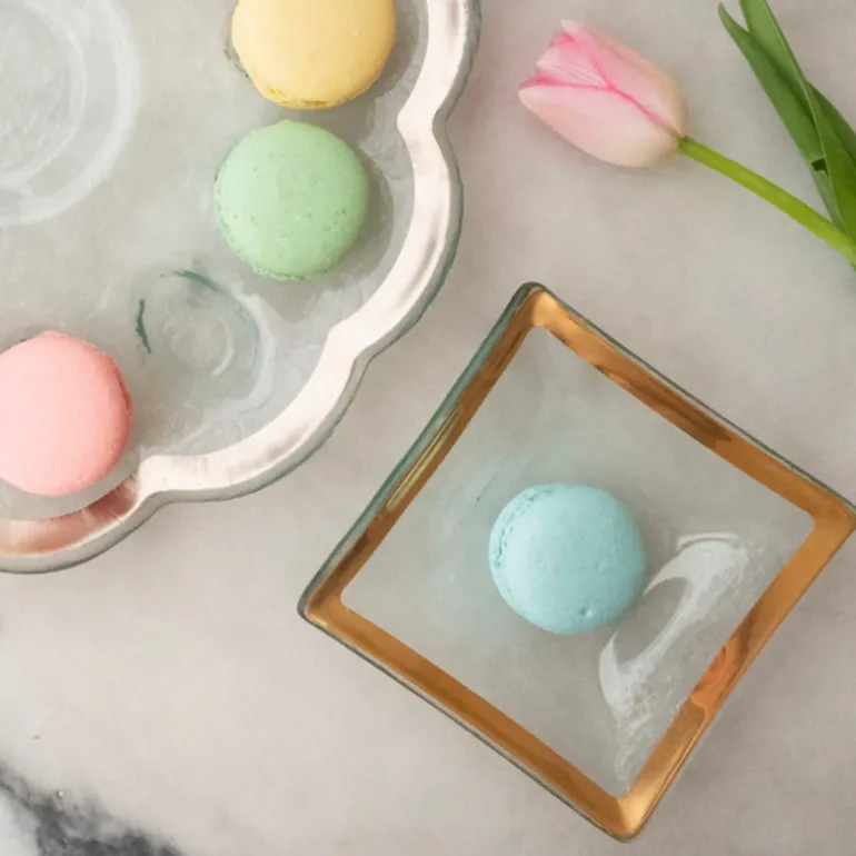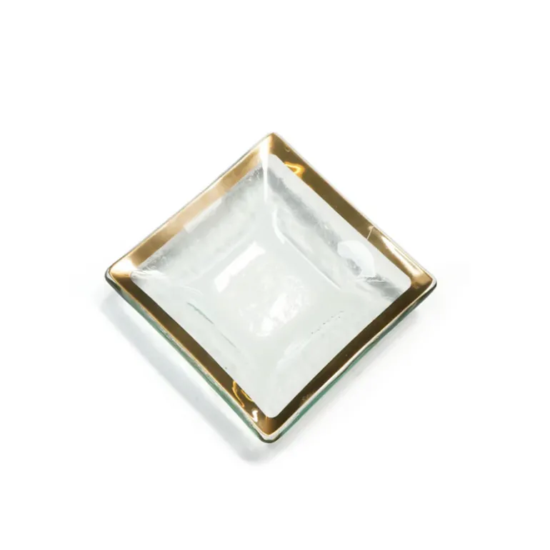 The Annieglass Roman Antique Small Square Dish can be used just about anywhere in the home. As a dinnerware piece, it can be used for appetizers or dessert. As home decor, it functions nicely as a tea lite candle holder. Shown as stacked with two larger Annieglass square trays. Wonderful in multiples, mix and match the 24k gold and genuine platinum trims for a unique handmade glass dinnerware set that exudes contemporary style and class. A bridal registry favorite, add these keepsakes to your wedding registry wish list.