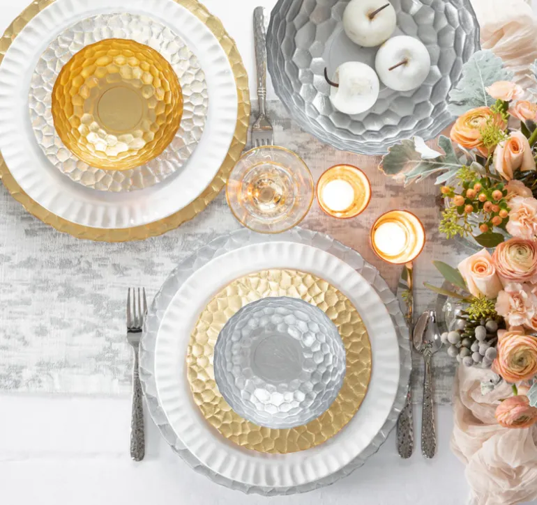 The Rufolo Glass Honeycomb Bowl by Vietri brings luster to your table. The glass piece features an organic, striking honeycomb pattern, and the final result makes a glimmering statement.