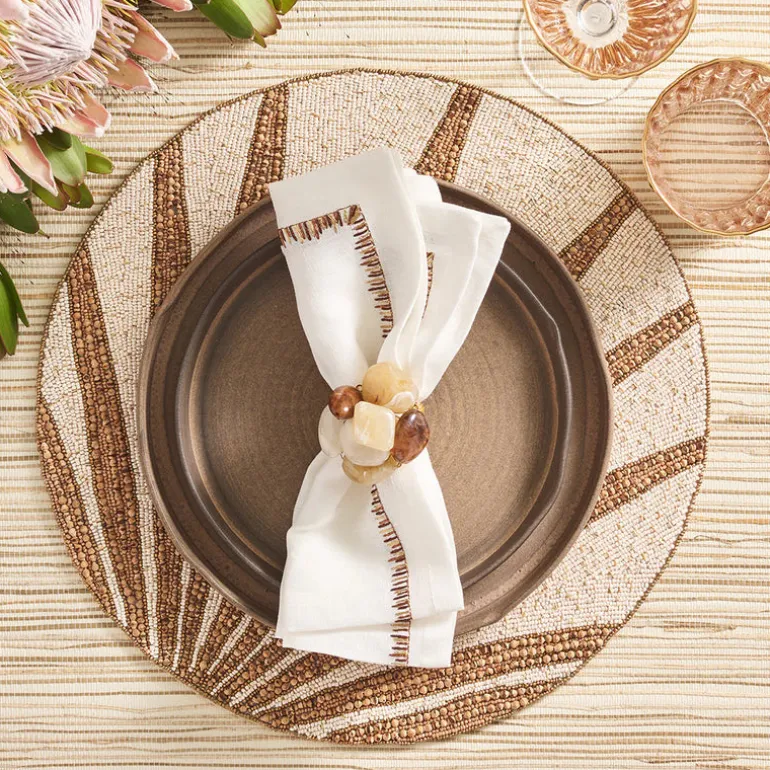The beaded Sea Stone Napkin Ring features resin stones that resemble sea glass. The stones on the napkin rings are arranged at random and mounted on a beautifully beaded napkin ring.