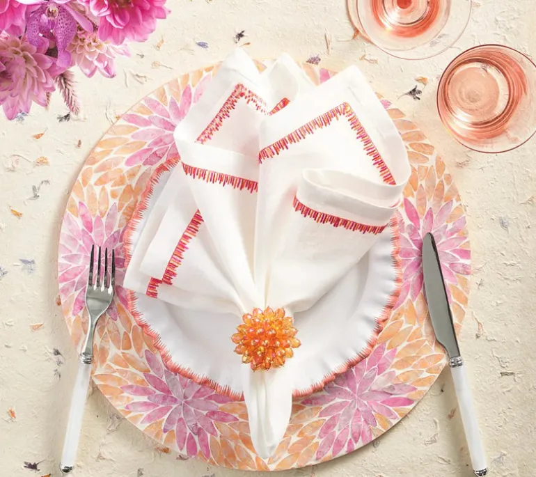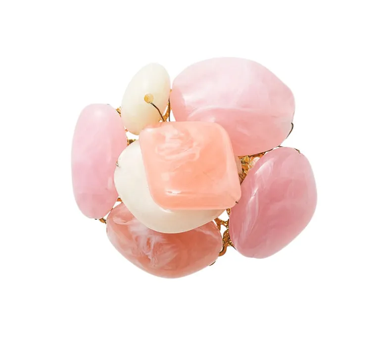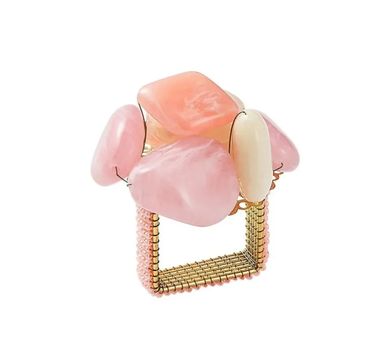 The Sea Stone Napkin Ring features the prettiest shade of pink blush and and cream resin stones set in clusters. These summery napkin rings are reminiscent of tumbled stones found upon the shore. Arranged at random, the stones are mounted on a beautifully beaded napkin ring. These beaded napkin rings are the perfect addition to a bright and cheery table.