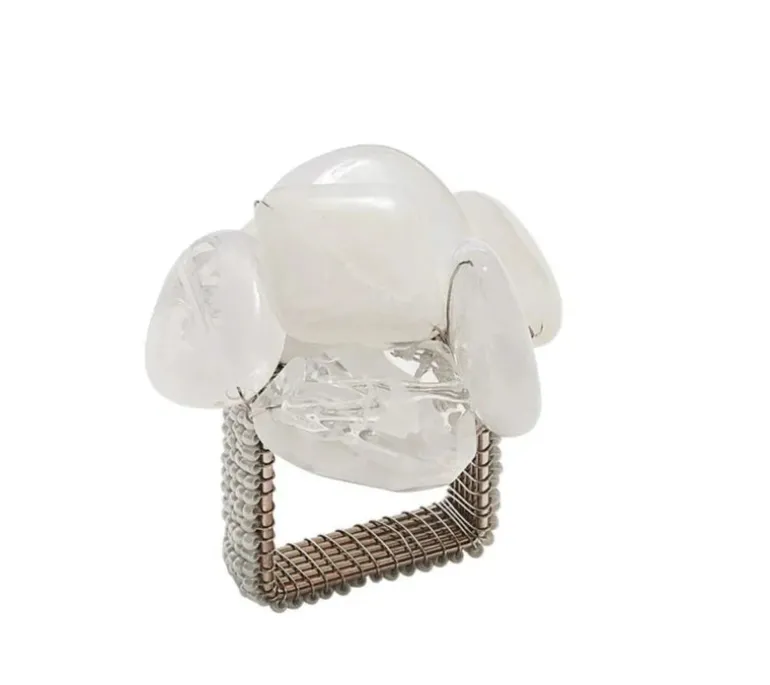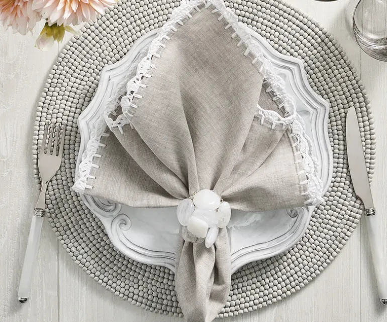 Set in clusters, the white resin stones of the Sea Stone napkin ring resemble the tumbled rocks found on coastal shores. The stones are artfully arranged at random and set on a beaded napkin ring that brings out the beauty of the larger rocks. This set of four white napkin rings brightens up any dining table.