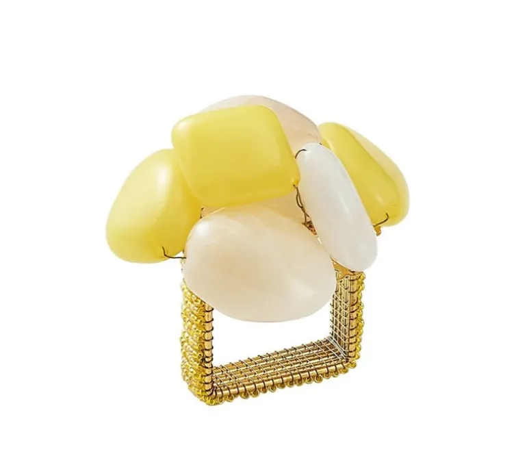 The Sea Stone Napkin Ring features sunny shades of yellow and cream resin stones set in clusters. These summery napkin rings are reminiscent of tumbled stones found upon the shore. Arranged at random, the stones are mounted on a beautifully beaded napkin ring. These beaded napkin rings are the perfect addition to a bright and cheery table.