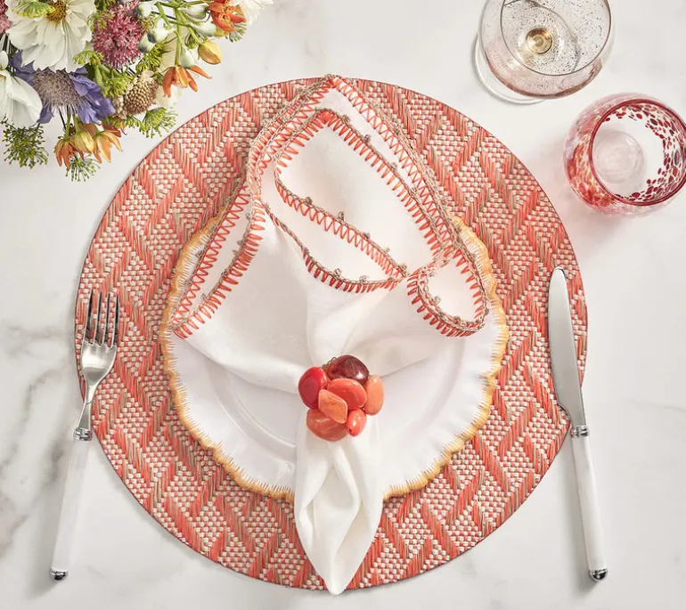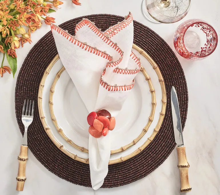 The Sea Stone Napkin Ring features bold shades of orange resin stones set in clusters, and are reminiscent of tumbled stones found along the shore. Arranged at random, the stones are mounted on a beautifully beaded napkin ring base. Count on these nautical accessories to bring a summery, bright flair to the table. They are beach décor at their best—bold and beautiful.