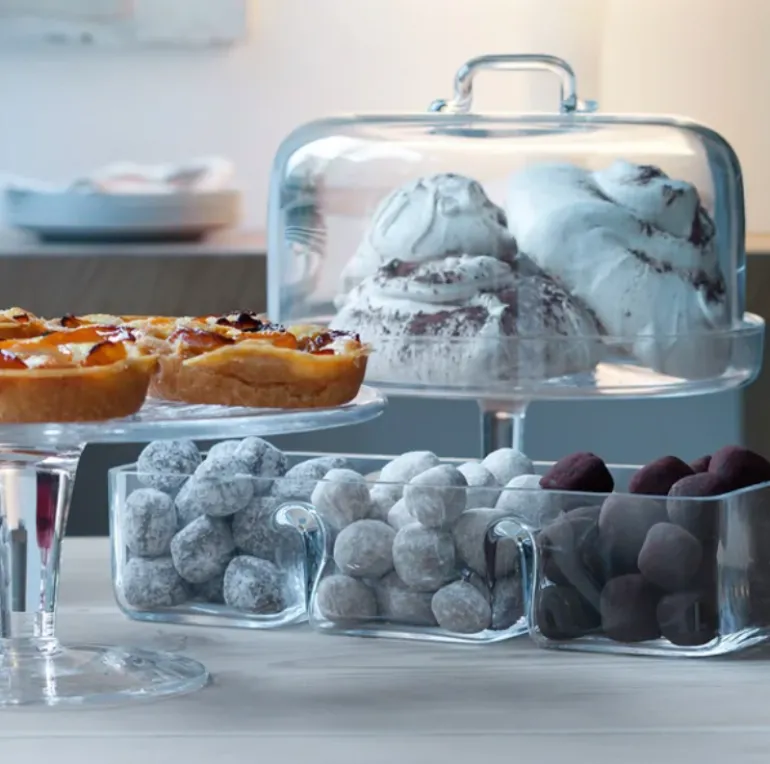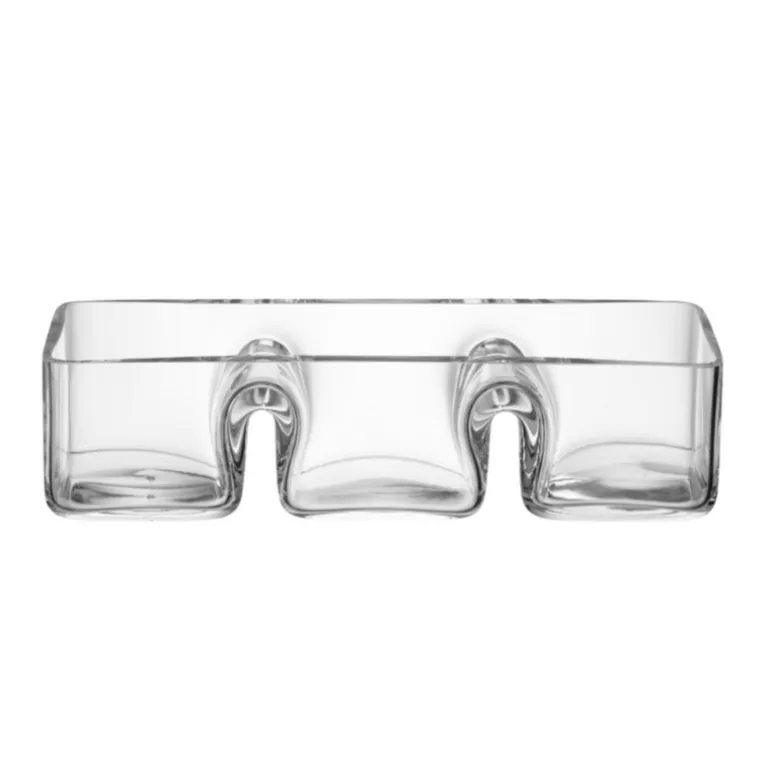 The Serve Rectangular dish is a mouth-blown glass platter with three compartments. Serve olives, nuts, sweets or sauces in this segmented glass dish made from mouth-blown glass. The rim is cut and polished to achieve a flat smooth finish.
