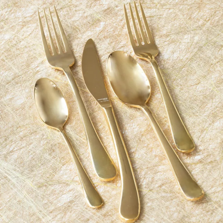 Soft, elegant lines grace each piece of the Settimocielo Oro Five-Piece Place Setting. Translated “seventh heaven,” an emphasis on balance and comfort is prevalent with this design. The knife is hollow-handled with a forged blade for cutting precision.