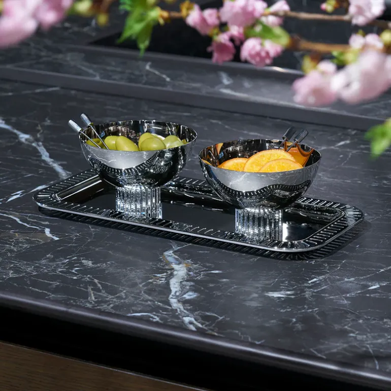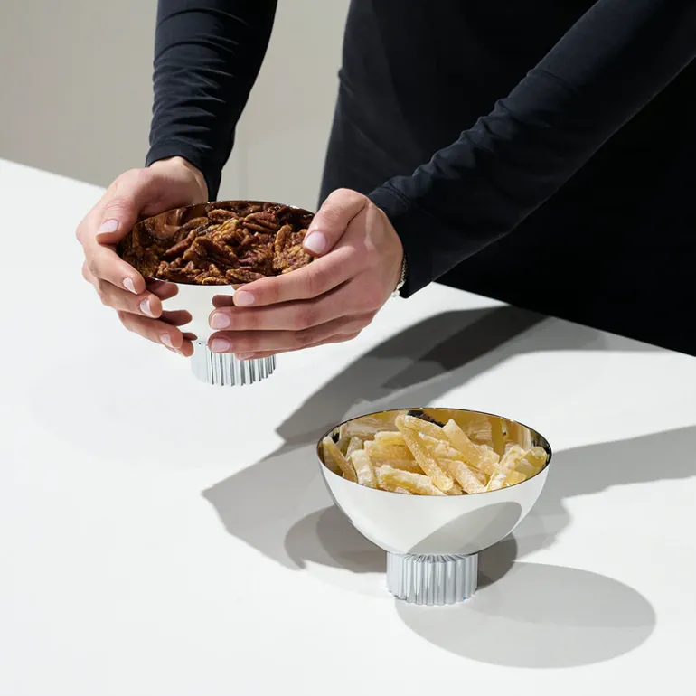 Introducing the Striations Nut Bowl, a sleek and sophisticated addition to your table. Crafted from durable stainless steel, its modern design draws inspiration from the organic beauty of nature, evoking images of swaying grass blades and mesmerizing glacial grooves in its intricate paterns. Perfect for displaying nuts or candies this timeless design will elevate your entertaining experience.