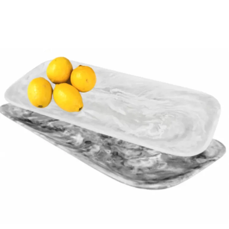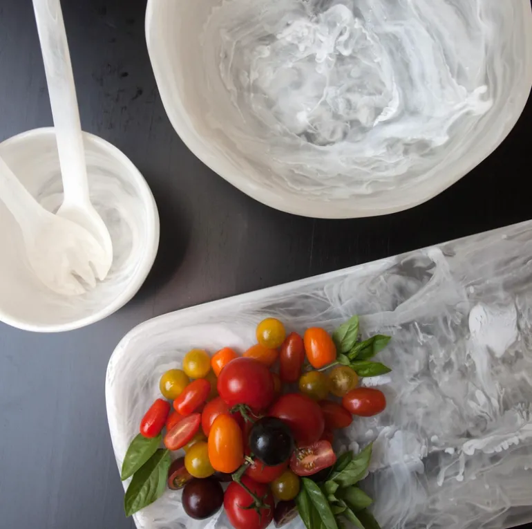 Our Resin Swirl Collection is a CH Favorite. The super chic pieces are handcrafted of smooth resin with simple, clean lines to show off the mesmerizing marbled color. Easy to mix and match yet durable enough for everyday entertaining indoors or outside. The rectangle platter is the ideal size for serving main courses or appetizers. We suggest adding a small deep bowl the platter to use for dips or sauces.