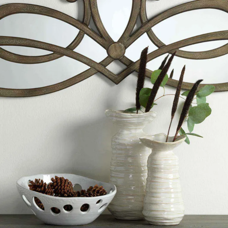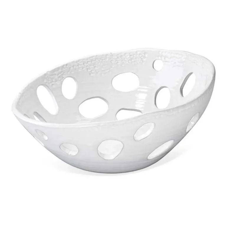 A monochromatic centerpiece with irregularly shaped cutouts and a natural organic texture. The Swiss Bowl is a glazed ceramic basin to display fruit or blown glass balls on your dining room table or counter. The irregularity in its fluid shape provides movement and interest.