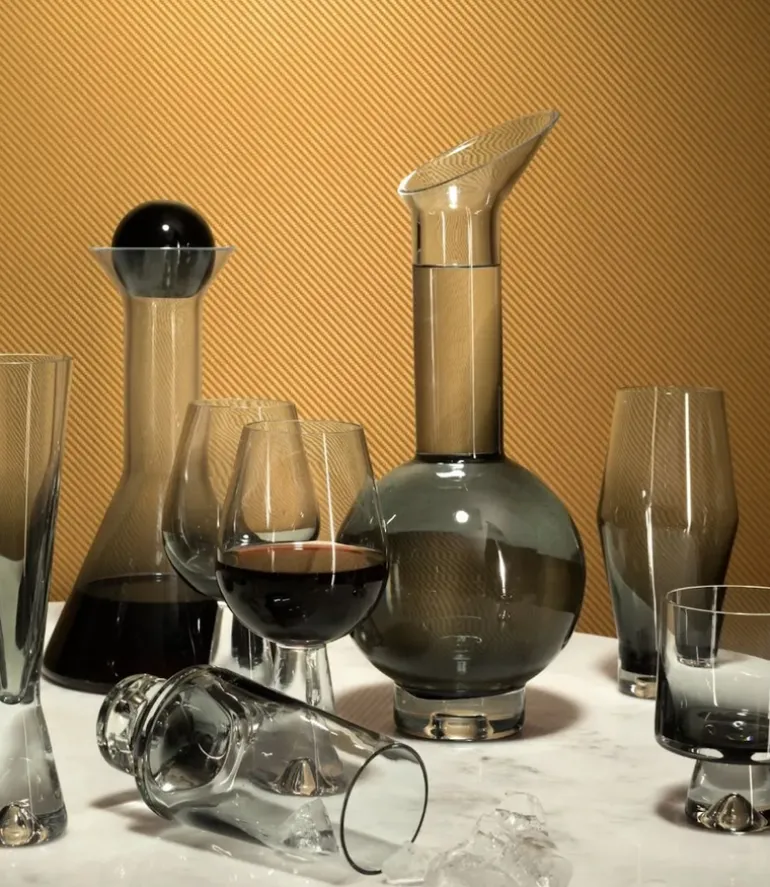 Each Black Tank decanter is handmade. The Black color sets a mysterious and indulgent tone to this glass bar collection. Created through a technically demanding fusion of clear and solid black glass, Tank is mouth-blown into the graphic forms for timeless tabletop architecture.