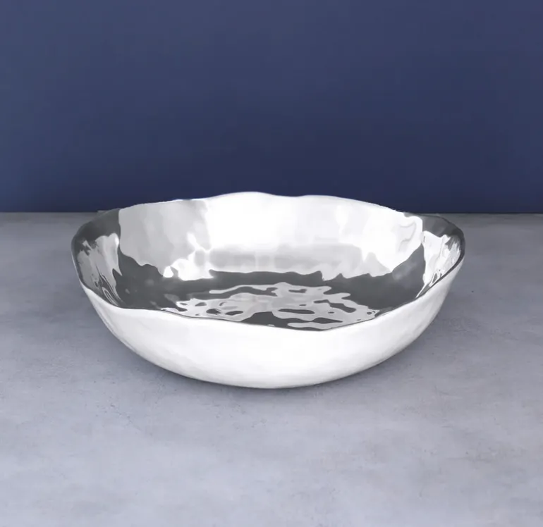 The Thanni Osaka Bowl has a beautiful contrast of white and silver. Elegant and durable, the Thanni Osaka bowl is a great size for salads and makes a striking centerpiece. This is a perfect housewarming gift!