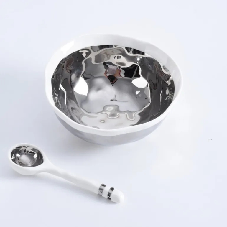 Each set includes a bowl with a matching spoon, both made of high-fired porcelain with silver finish. beautifully gift boxed.