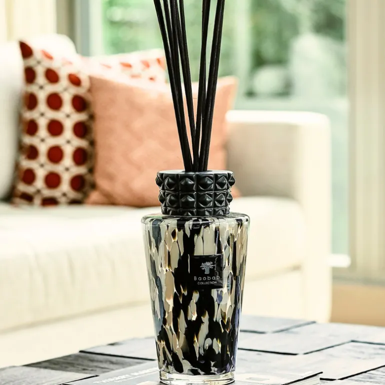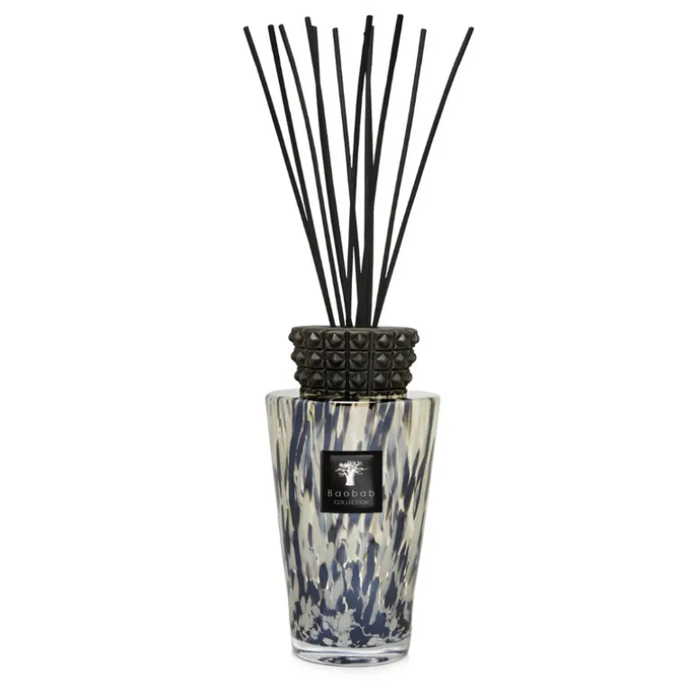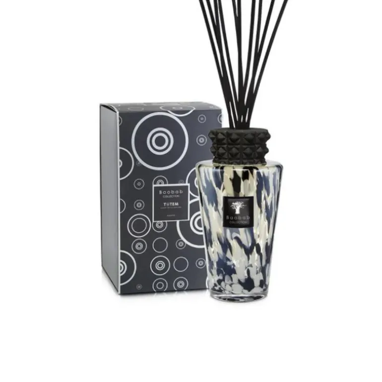Hand-blown by glass artisans, the glass is decorated with black and iridescent details that reference black pearls of the Pacific Ocean. The decorative and sculptural cap is made from glazed ceramic with a graphic relief, an unexpected twist that gives the bottle a tribal and ornate quality.