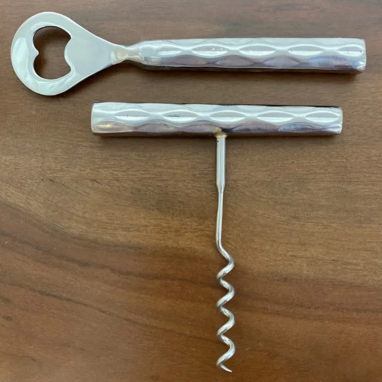 The Truro Platinum Bottle Corkscrew set is crafted of 18/10 stainless steel and finished with 24k gold. Michael’s Truro metal serve ware is named after walking on the sandy beaches of the eponymous Truro, Cape Cod.