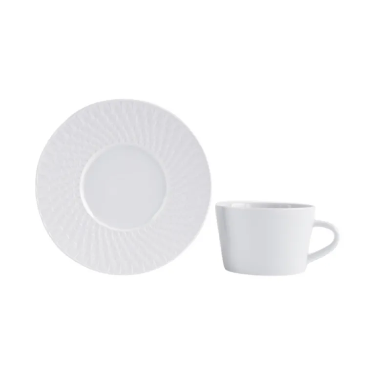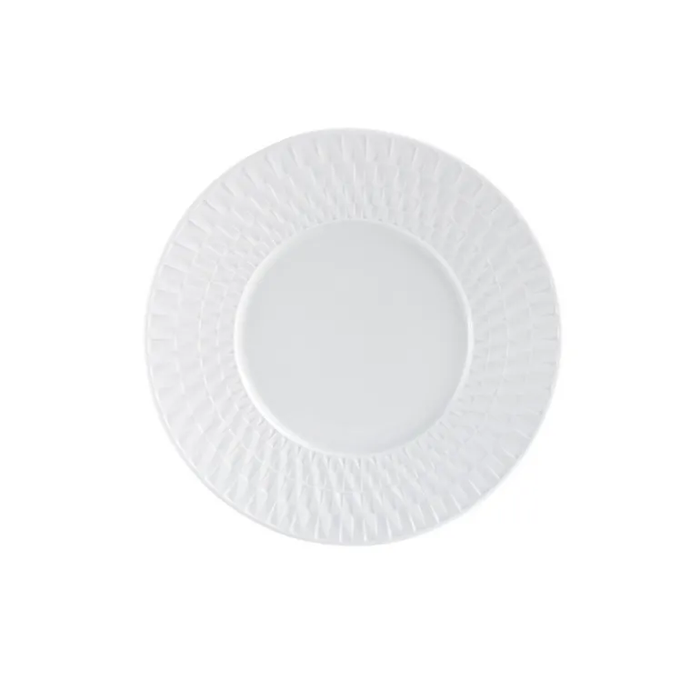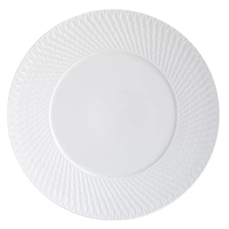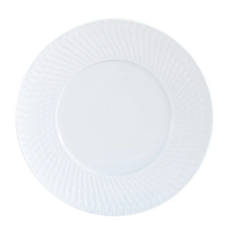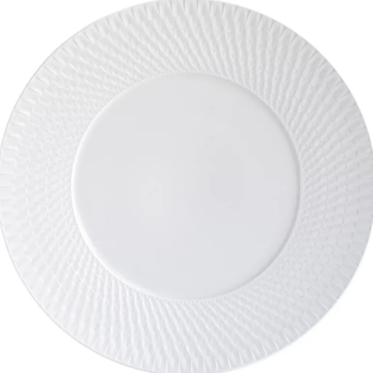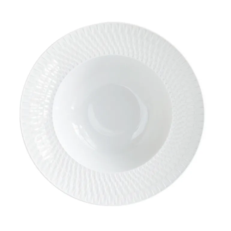 The delicate design of this new collection combines various influences: the light effects of the rice paper Japanese screens, the art of origami folding, the braiding and caning of the furniture of the 50s, not to mention the 3D graphics offered by the new technologies. The result is an unprecedented subtle effect of a rigorous geometric pattern taken in twisted momentum that is engraved on the rim of the plates and on the outside of the various pieces of the collection.