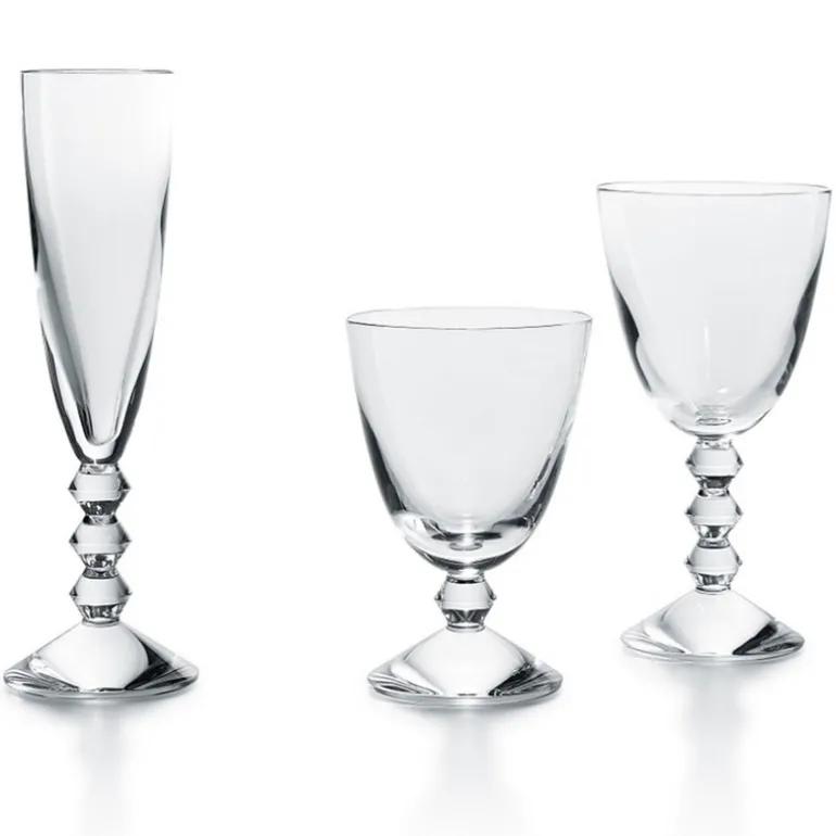 Designed for Baccarat by Savinel & Roze, the upper smoothness is juxtaposed with lower angularity: the curvature of the bowl contrasts sharply with the bevel-cut zigzag of the stem. The innovative form adds to the enjoyment of sipping a quality vintage. The Vega set also includes a champagne flute, martini glass, and other bar and tableware.