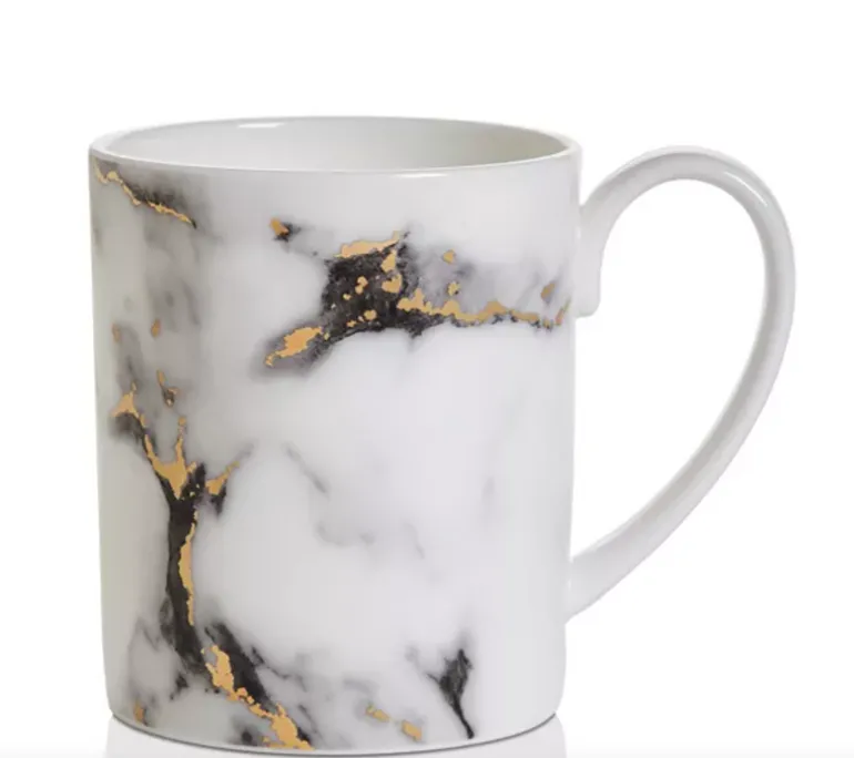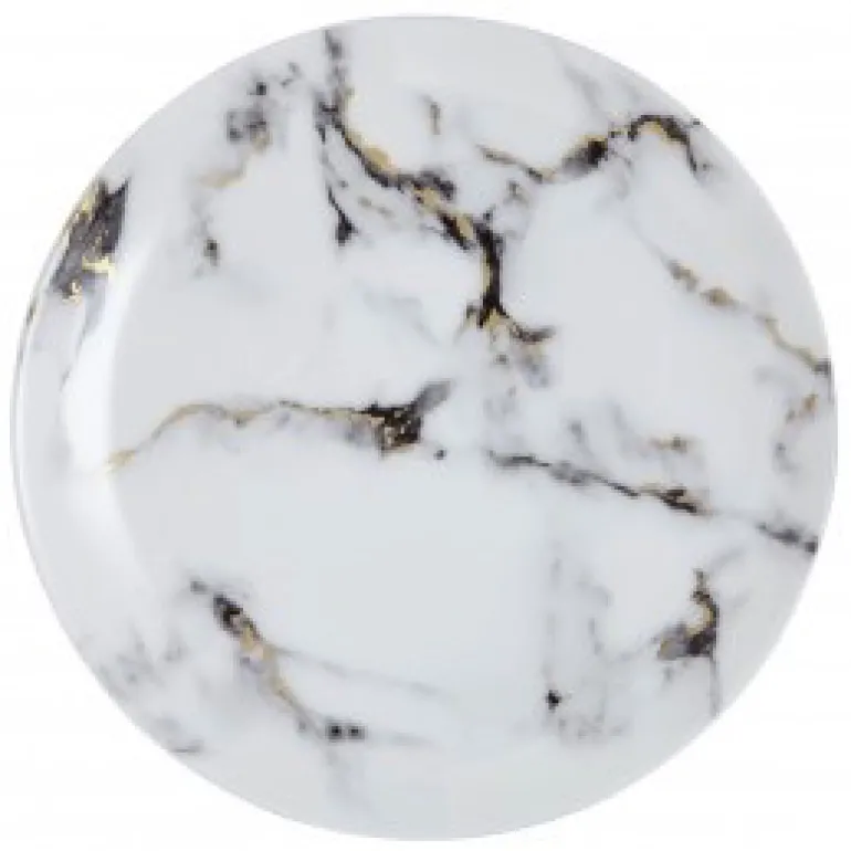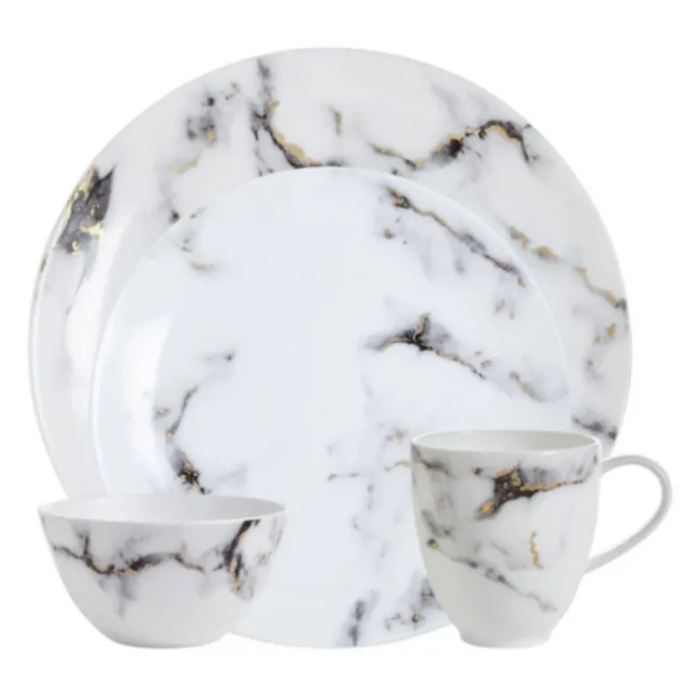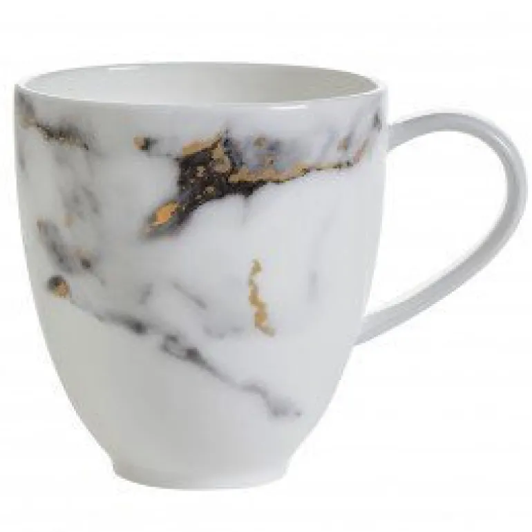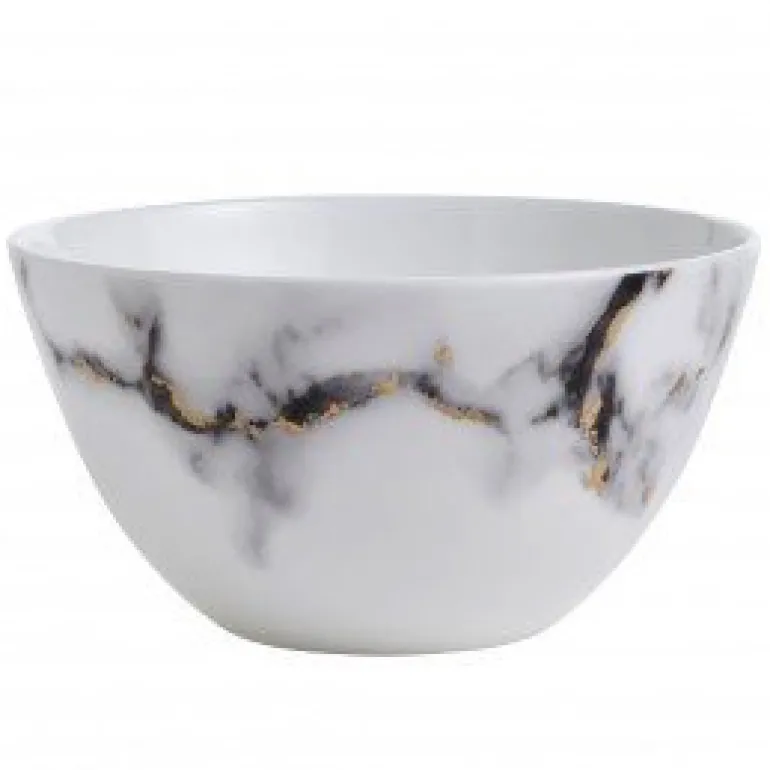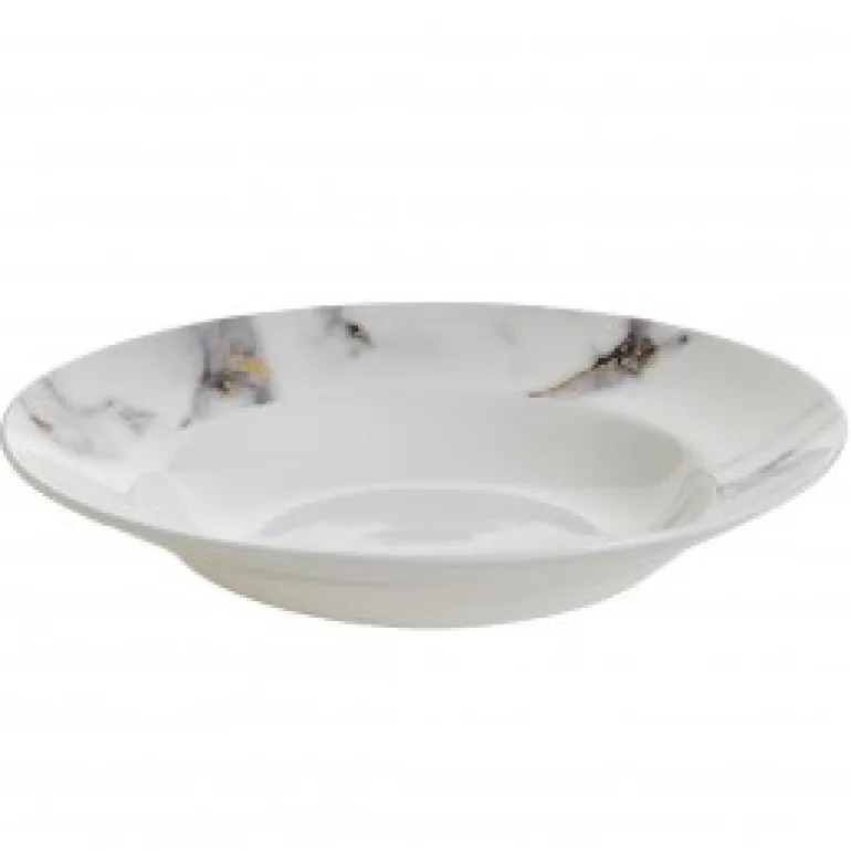 A modern design with a mottled grey marbelized look that is accented with 24k gold detailing throughout. The high quality bone china is durable and dishwasher safe using a non citrus detergent. Not able to be used in the microwave. Additional serving pieces are available. Call for details!