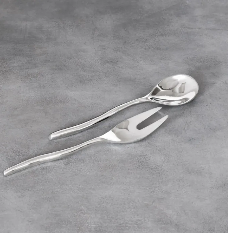 Inspired by natural forms, this brilliant, artisan-crafted salad server set is made of hand polished metal.
