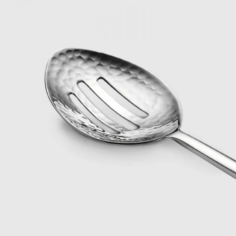 An essential for your flatware collection, our Versa Slotted Serving Spoon is ideal for serving vegetables without its liquid. This modernist design with micro hammered top and sleek handle is practical and handsome. Handcrafted and never needs polishing!