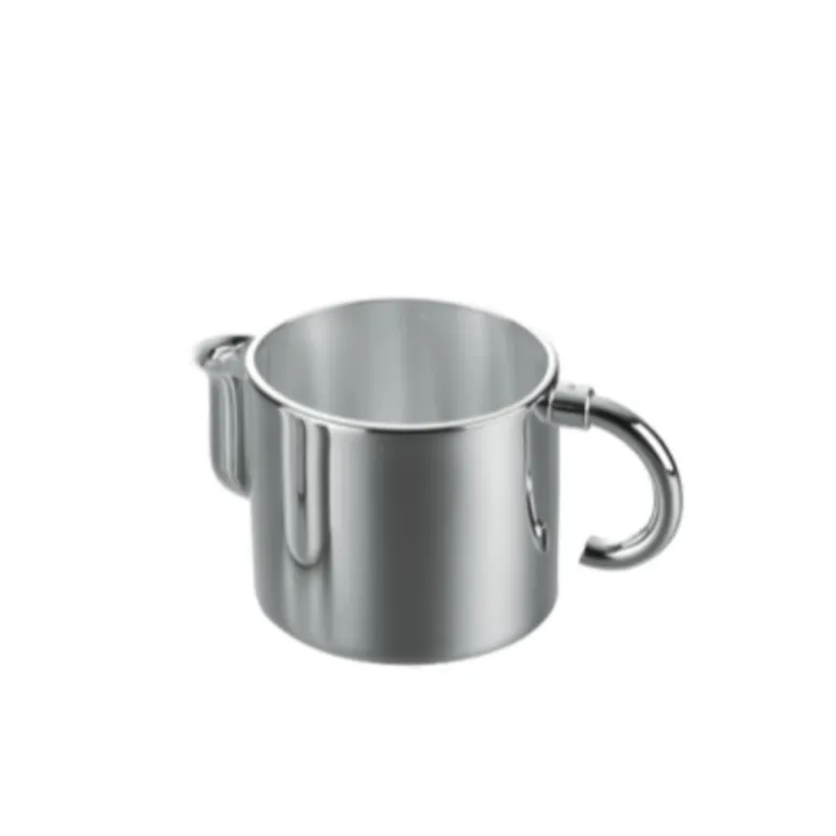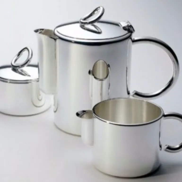 Indulge in elegance with our Vertigo Silver Plated Creamer. This modern and chic pitcher adds a touch of playful refinement to your beverage service. Designed by Andrée Putman, the bold and asymmetrical ring motif is found on every piece in the collection, including the sugar bowl, coffeepot/teapot, and teacups. Elevate your tea or coffee experience with this luxurious addition.