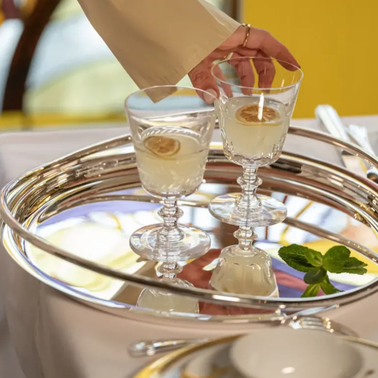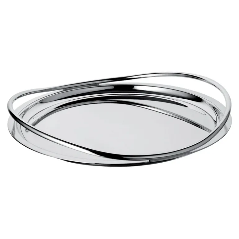 Use the large silver plated round tray to serve food or display your favorite objects. The raised openwork rings double as handles. Vertigo’s bold motif — a subtly asymmetrical, thick ring often placed at playful angles — can be found on every piece in the collection designed by Andrée Putman.