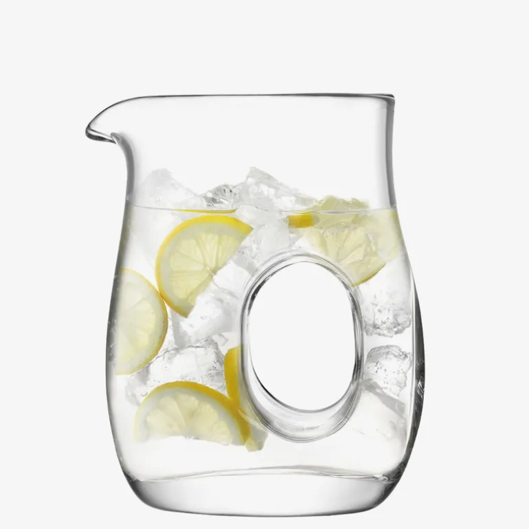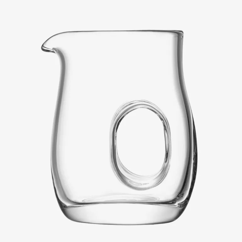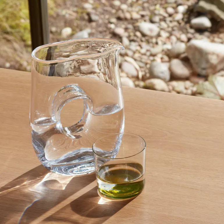 The Void Jug boasts an organic shape and a handcrafted, mouth-blown glass body with an ample opening. The center features an elliptical hole that is meticulously formed by hand during the malleable stage of glassmaking.