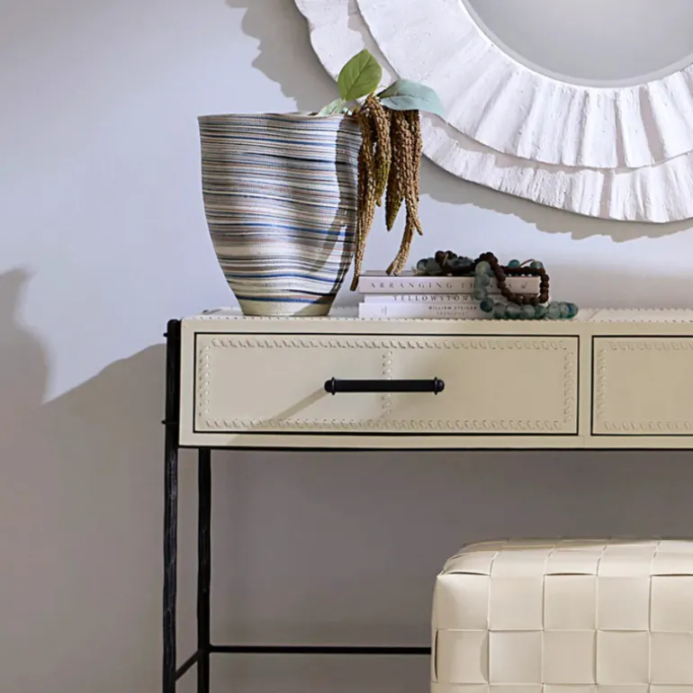 Handcrafted with playful horizontal stripes in cloud white, soft sand, and sky blue, this porcelain vessel adds a pop of color and texture to your space. Inspired by desert landscapes, it effortlessly blends casual elegance with versatility as it can display your favorite fillers or hold water. A charming addition to any warm and welcoming interior.