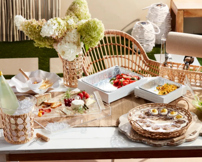 Take a dip outdoors with this chip and dip set. It includes an acrylic bowl that is elegantly encased in a woven seagrass exterior sleeve and dip bowl for snacking, adding a touch of natural charm to your entertaining space.